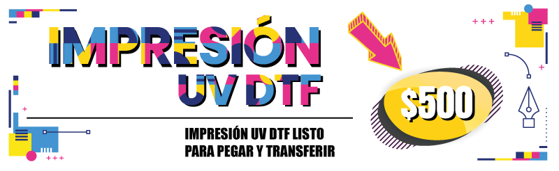 Impresión DTF UV sobre película transparente para transferencia a presión en Plotter de alta Calidad Fotográfica en tamaño de 58x100cm a 1440 dpi´s con capacidad de producción de 10m por hora.